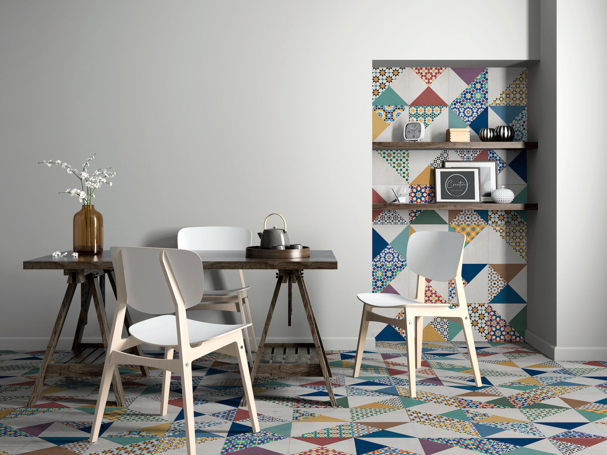 De manera concreta, en cuanto a las novedades de Creative en porcelánico cabe destacar los modelos Chess, que reproduce la estética de los hidráulicos con el valor añadido de un efecto plata a base de metal real en los bordes de la pieza; Lily, que presenta un diseño en formas de aspas inspirado en los tradicionales craquelados con un aspecto de azulejo envejecido; Medina, que actualiza los motivos del clásico azulejo árabe y los saca de contexto para dotarlo de colores brillantes y geometrías de inspiración ornamental; y Trazos, un cemento muy destonificado que va del blanco al negro pasando por grises degradados y con el que las posibilidades decorativas se multiplican gracias también al uso de un recurso geométrico.